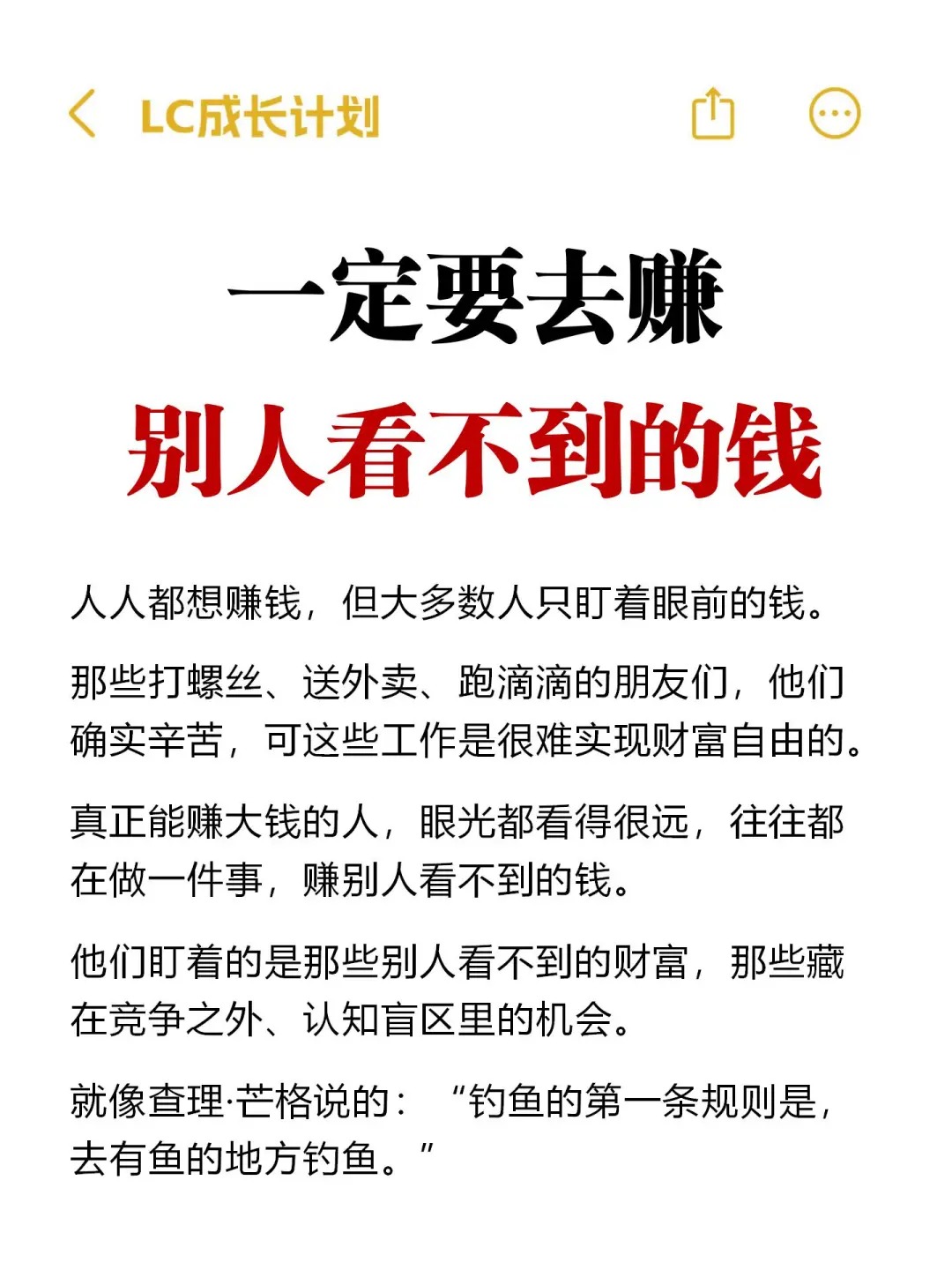 而真正能赚大钱的人,跟大家不一样的地方在于,他们眼光看得远,不跟别人挤在一块儿抢眼前的小利,反而在做一件事:赚那些别人看不见的钱。他们盯着的不是明面上的那点收益,而是藏在 “大家都没注意到” 的地方 —— 可能是别人没看到的竞争空白,也可能是大多数人认知不到的机会。