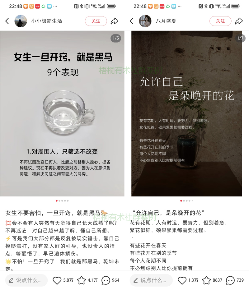 接下来,就是内容了,内容从哪里找呢?还得是小红书上找比较好,可以在小红书上面搜索:女性成长、励志语录...只要是正能量的关键词,可以多去搜一下,能找出来很多像这样的——