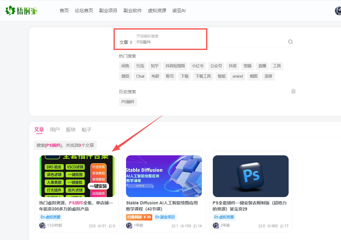 首先,资源大家不用到处去找了,已经给大家准备好了,打开梧桐有术资源站或者公众号,直接在上面搜索:PS插件,就能找到资源。