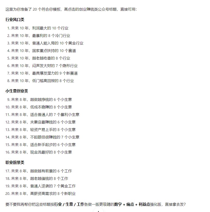 这些都是讲的小生意赛道,用AI直接生成就可以,甚至很多都是一字不差的复制粘贴,连修改都没有修改,上去直接怼,但咱们今天讲的跟小生意不同,哪里不同呢?咱们讲的是“未来赛道”,也就是以后的趋势。