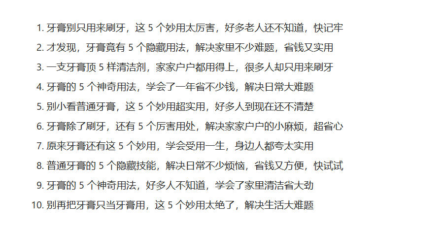 具体的提示词和搜集的爆款标题,咱们一并放在视频教程里了,单以“生活小技巧”这个类型去写内容的话,肯定是不行的,我们应该具体以某个物件来写内容,比如:牙膏、塑料瓶、牙签、罐头瓶、废手机...这样写出来的内容才会五花八门,更有意思,而且意义表达明确。